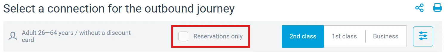 To book only a reservation, search for a connection on the desired route using the journey planner. Then select the Reservation only option.